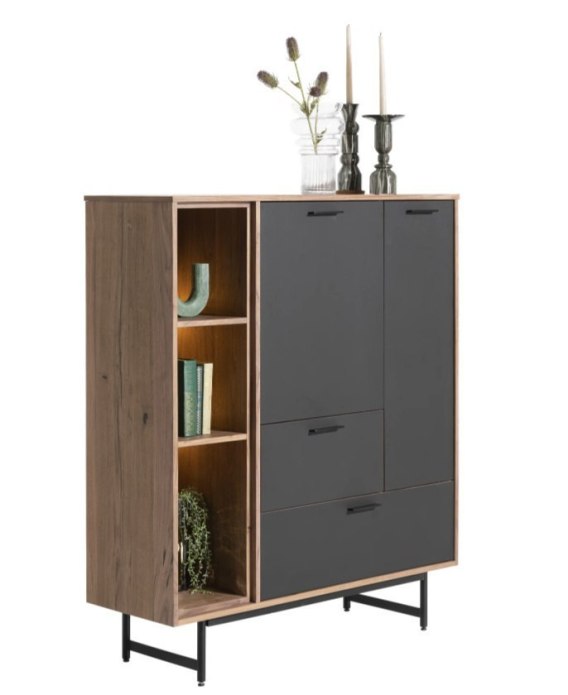 Ten stylowy kredens z nowej kolekcji TORANO oferuje nie tylko mnóstwo miejsca do przechowywania; możesz także pochwalić się swoimi najpiękniejszymi dodatkami! Eleganckie i minimalistyczne wykończenie sprawia, że ta szafka o połowie wysokości pasuje do wielu stylów wnętrz. Kredens składa się z połączenia lakierowanego forniru orzechowego i (odpornych na zarysowania) matowych, czarnych, trwałych frontów HPL z miękkim w dotyku i łatwym do czyszczenia wykończeniem. Kredens ma 2 drzwi z systemem cichego domykania, 2 szuflady z całkowicie wysuwanymi, niewidocznymi prowadnicami i 3 wnęki z oświetleniem LED.