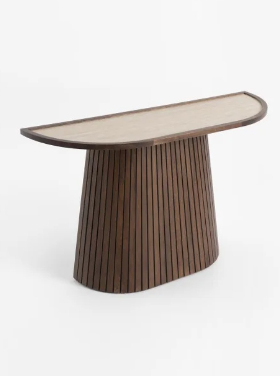 • Elegancka owalna konsola CLEO COCOmaison 130 cm, blat HPL o wyglądzie trawertynu, brązowa podstawa z lamelami