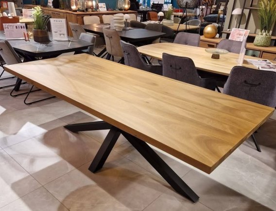 Charakterystycznym elementem stołu jest centralna noga typu „pająk" - metalowa konstrukcja o geometrycznej formie, która nie tylko zapewnia stabilność, ale także nadaje meblowi industrialny charakter. Dzięki temu projekt świetnie wpasuje się w przestrzenie urządzone w stylu nowoczesnym, loftowym czy minimalistycznym.